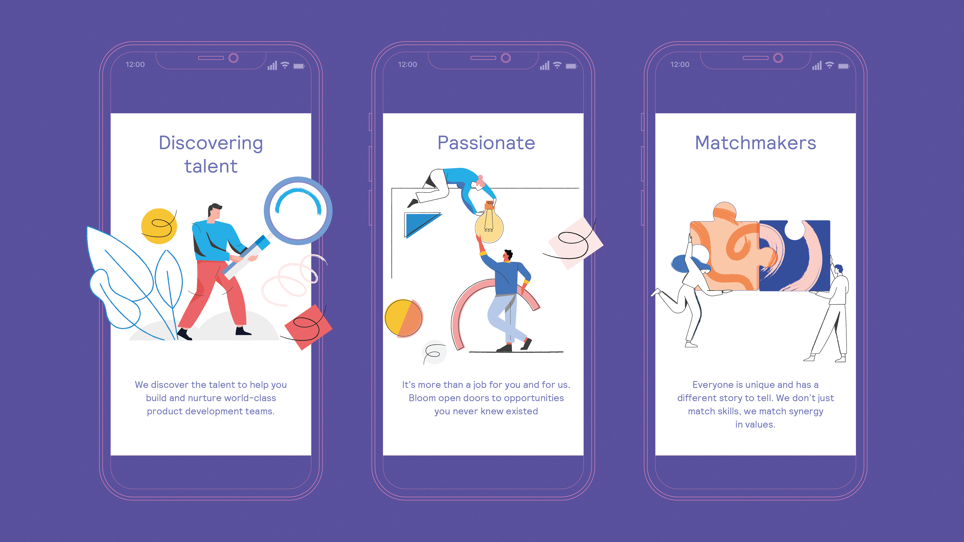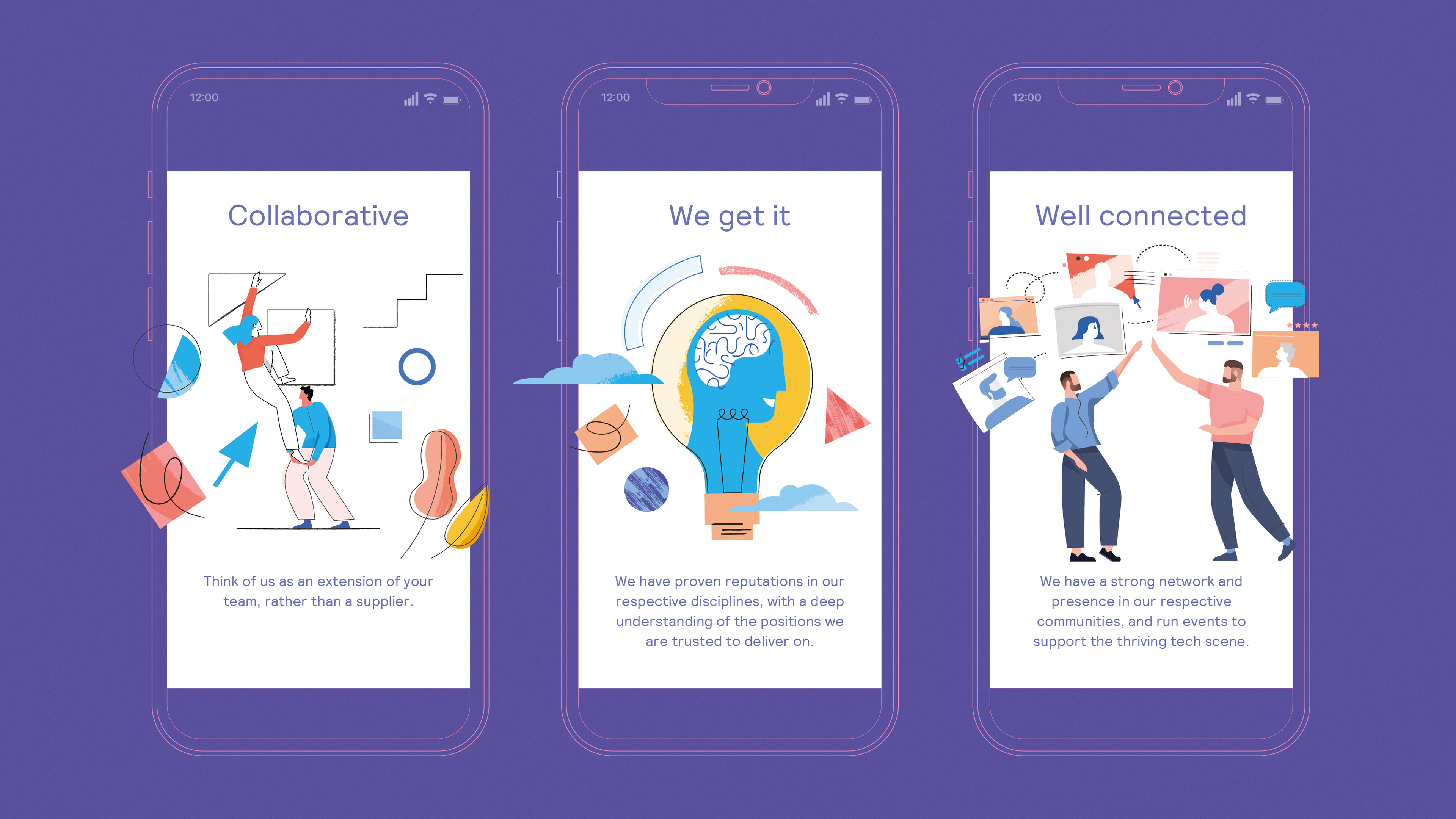 A series of illustrations helping to bring to life a tech recruiters mission and personality. A playful and emotive way to engage with candidates and create connections.